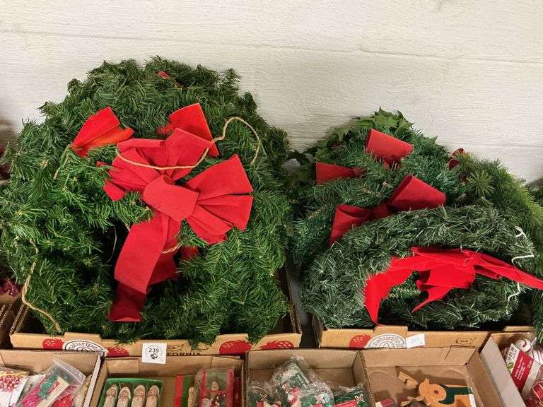 LOT 239 - Green Wreaths with Red Velvet Ribbons (8), Teardrop Garland (2)
