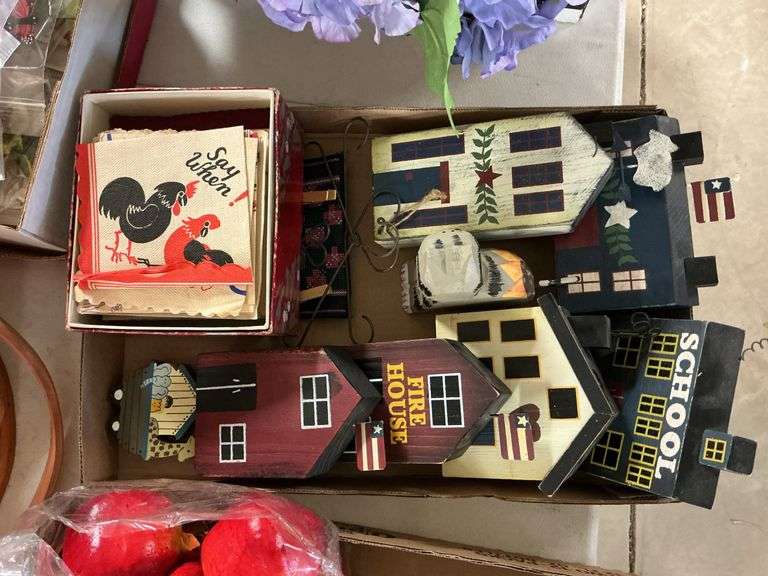 LOT 349 - Small Wooden Houses, Cat, Napkins, Quilted Hanger Decorations