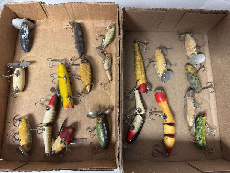LOT 646 - 2 boxes of lures - vintage wooden lures - mouse, Jitterbugs,