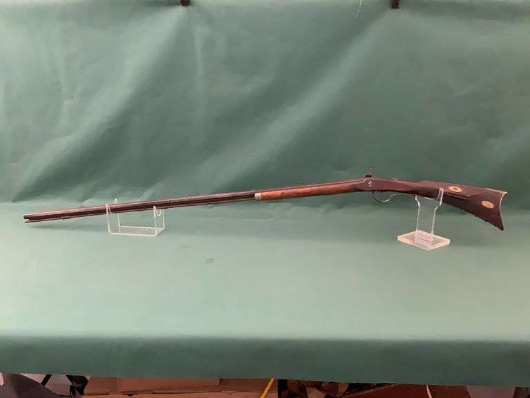 antique rifle, No maker makes, 40" barrel, corrosion in bore, all metal brown with heavy patina and wear, ram rod is stuck in gun, lock functions, wood has heavy wear, toe is broken and loose, the rest is solid, see photos for details