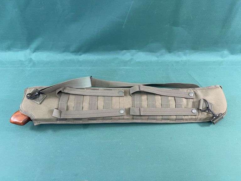 18.5" barrel, NSN, Must be 21 years old or older, green nylon scabbard and machete, cut down, wood refinished, heavy rust/pitting on metal, all metal brown, forend cracked, screw not original, grip cracked near tang, see photos for details