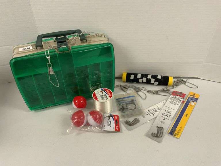 Tacklebox, Bobbers, Line, Stringer, snell hooks. see photos for details. all for one money.