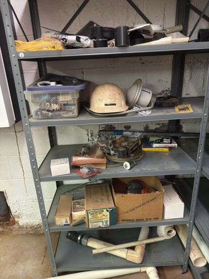 LOT 31 - Contents of metal shelving unit, shelving unit not included, PVC pipe, plumbing items, hardhat, smal