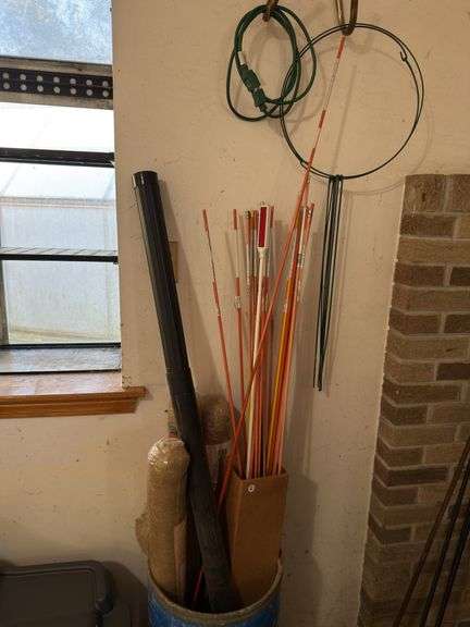 LOT 80 - Bucket, full of snow poles, driveway, marker, burlap, peonies stands, extension, cord, all for one m