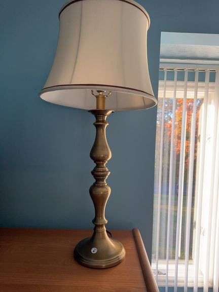 One brass lamp, tall, one small brass lamp, and one glass lamp