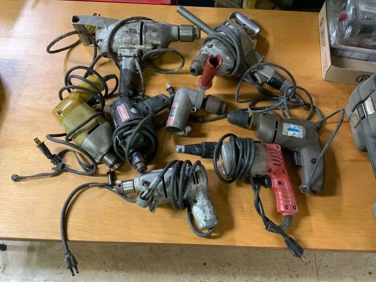 LOT 36 - 7 Corded Drills & Right angle attachment.