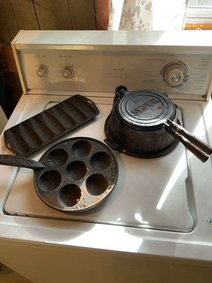 LOT 133 - 3 Cast Iron Pieces, 1 waffle maker, corn tin and egg tray