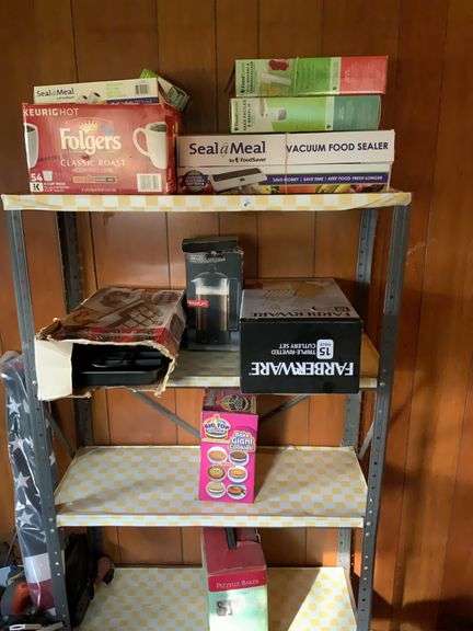 LOT 145 - 4 Shelf Open Rack with Contents ( Vacuum Seal Machine and Parts, Brownie Tin, Knife Set, Itialian Co