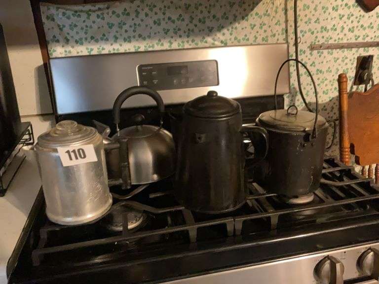 LOT 110 - Lot of Tea Pots - 4 Tea Pots and 1 Iron