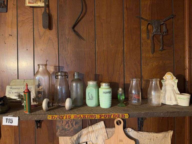 LOT 115 - Vintage Display Lot 2- Shadowbrook Milk Bottles, Salt and Pepper, Brushes, Henning's Grange Block, B