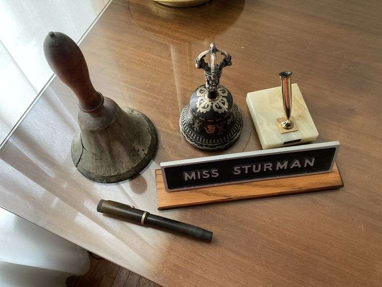 LOT 216 - Teacher’s bell with a crack, a Tibetan handmade bell, and a nameplate on a wooden stand and a Marble